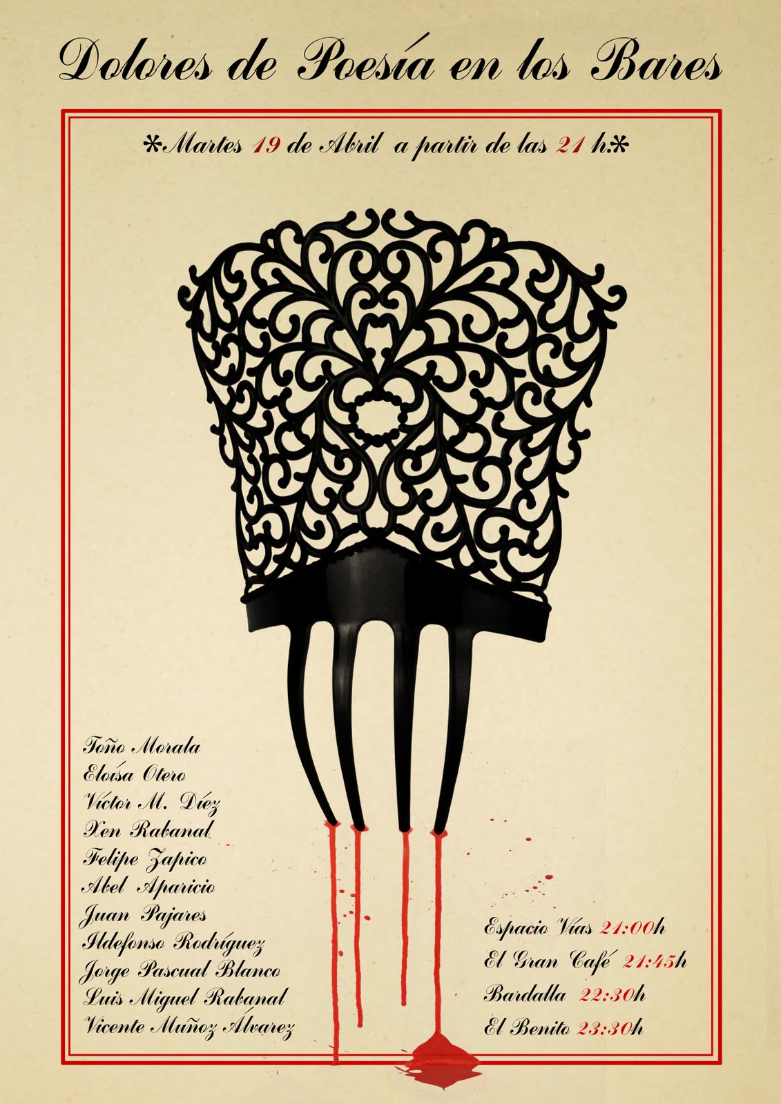 ‘Dolores de poesÃa en los bares’, cuyo cartel anunciador es fruto de un diseño de Julia Velázquez, nace por iniciativa de Felipe Zapico (cuyo poemario ‘Litro de versos’ ha disfrutado de una excelente acogida), —“ llegamos, tomamos algo y cada uno o una leemos alguna cosa, y a otro bar; si conseguimos que nos acompañen amigos hacemos una ronda, que no es de papones, no de GenarÃn, no del rancio reinoâ€, apuntaba hace unas semanas Zapi en el blog de EloÃsa Otero ‘Isla Kokotero’— y su caracterización ha ido matizándose a lo largo de las últimas semanas, encontrando en el homenaje a Chema Baños (fotógrafo estrechamente ligado a algunos de los poetas participantes) la excusa idónea para darse impulso.